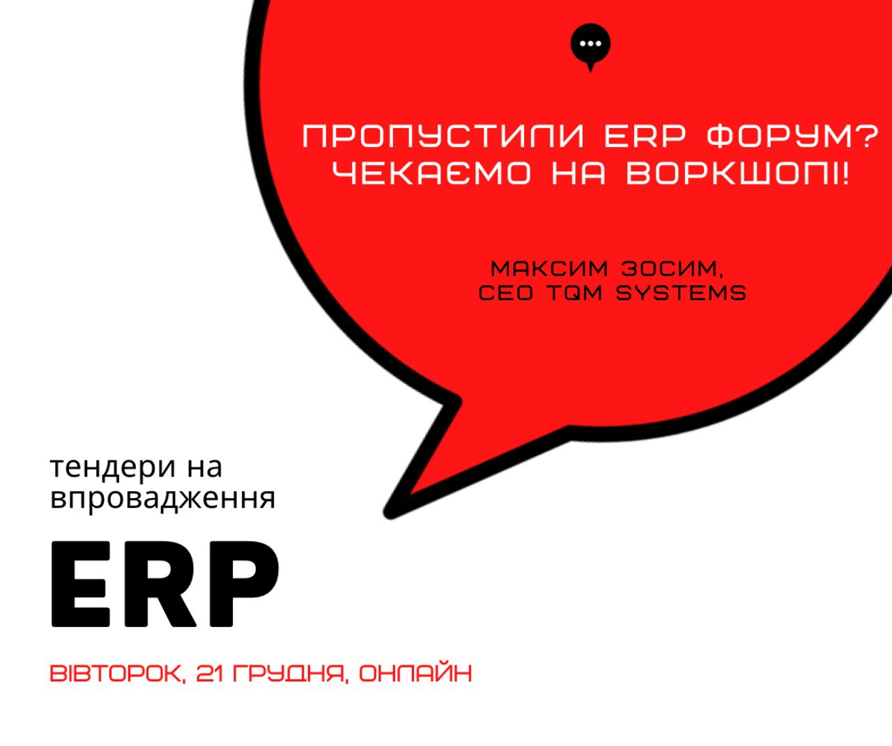 Тож завтра, у вівторок, 21 грудня, чекаємо вас на окремому воркшопі з тендерів на впровадження ERP. Починаємо о 19.15, плануємо вкластися у дві годині.