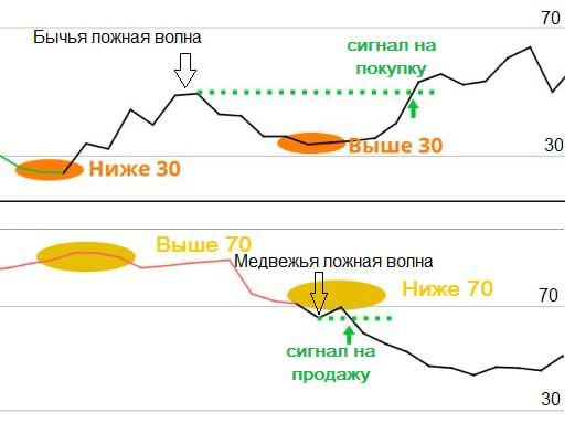 🔹 бычья ложная волна - линия RSI опускается ниже 30, потом поднимается выше нее и откатывая назад не достигает уровня 30. Сигнал появляется при пробое предыдущего максимума;