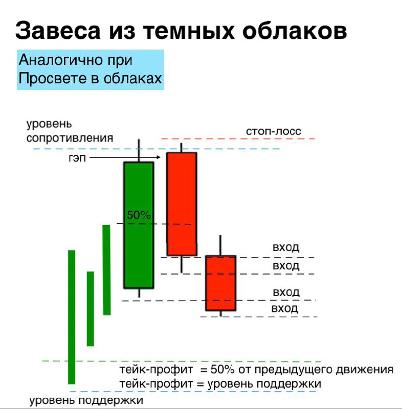 🔹 Для завесы - 2я свеча медвежья; для просвета - бычья. ❗️ВАЖНО, что она должна перекрывать не менее 50% тела первой свечи. Также должна быть полнотелой без длинных теней.
