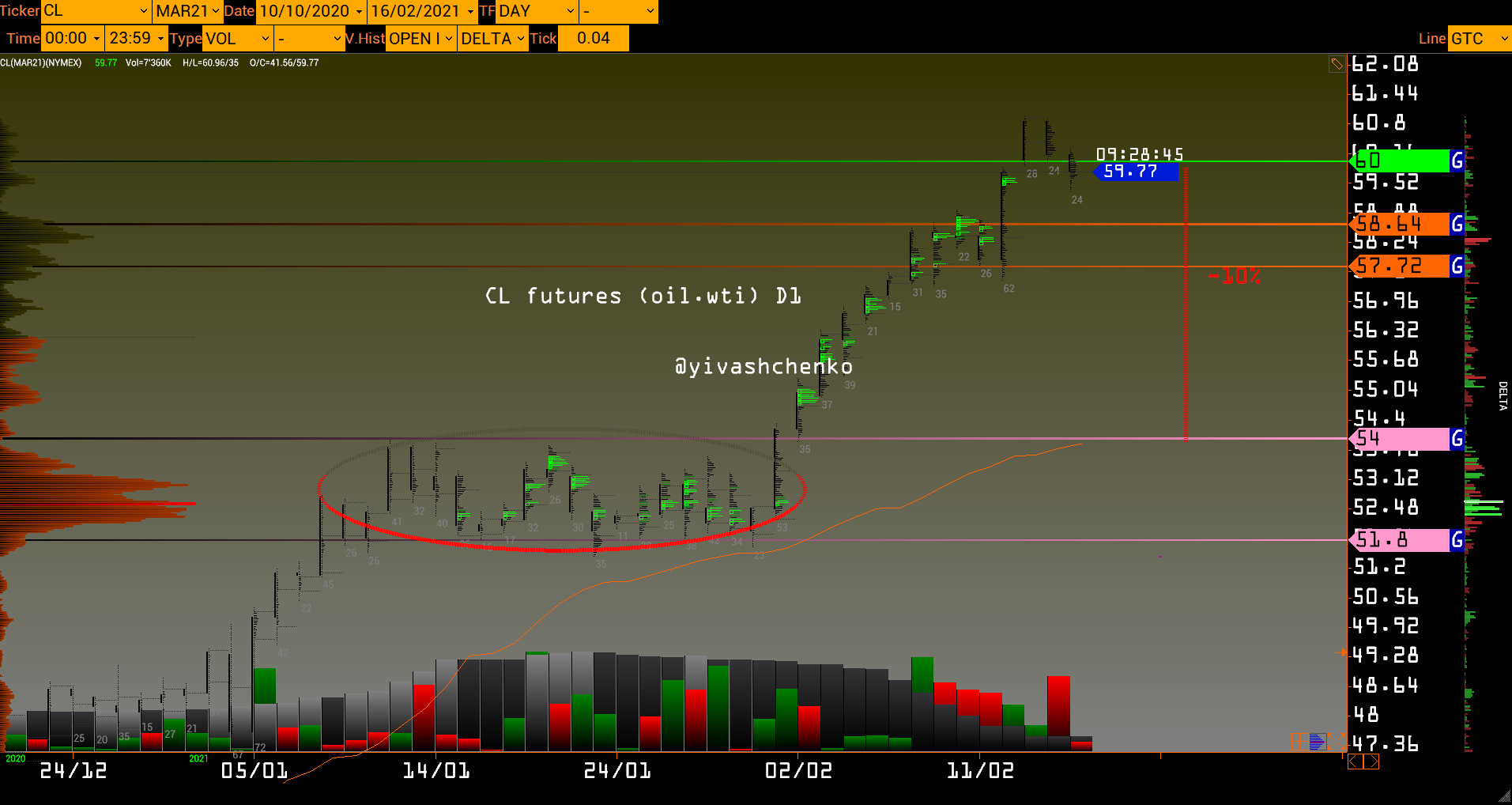 Рост нефтяных котировок на прошлой неделе на $4 во многом связан с рекордными холодами в Техасе, что привело не только к отключению электричества, но и остановки нефтяных скважин. В результате рынок лишился дневной добычи примерно 1 млн. баррелей. Хочется отметить, что ситуация на сегодня уже стабилизировалась и Техас добывает в обычном режиме. Нормализация ситуации может привести к коррекции нефтяных котировок обратно на $3 - $4. Также стоит понимать, что текущий восходящий тренд нефти вызван двумя основными факторами – рост инфляционных ожиданий и сокращение добычи ОПЕК+. Инфляция продолжит оказывать поддержку товарным рынкам, но вот ОПЕК+ вряд ли пойдет на дальнейшее сокращение добычи при текущих ценах на нефть и амплитуде их роста. Суммарно, указанные макро факторы могут привести к коррекции нефтяных цен на 10%. Если посмотреть на график фьючерсов WTI, то коррекция на 10% - это тест ключевой зоны скопления ликвидности 54,00 – 51,80. А подтверждением начала этого сценария можно считать пробой вниз локальной кластерной зоны 58,64 – 57,72. @yivashchenko
