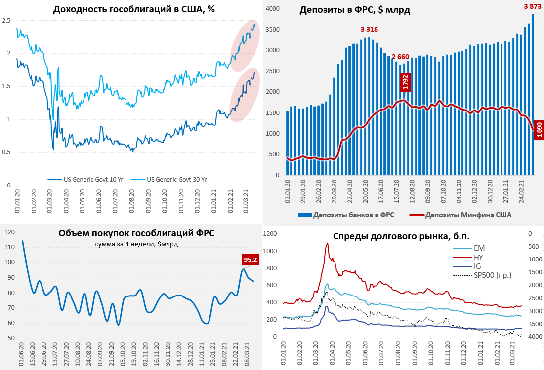 С одной стороны, активное расходование запасов наличности Минфина США наводняет систему новой ликвидностью и деньгами, за полтора месяца в систему упало почти $0.7 трлн. Но есть и другая сторона этого процесса – «заначки» американского Минфина так быстро сокращаются, что такими темпами идти на рынок придется скорее раньше, чем позже и это создает напряжение на рынке гособлигаций. Ведомство Дж. Йеллен прогнозирует остатки наличности на конец 1 квартала на уровне $0.8 трлн, а на конец 2 квартала они должны упасть до $0.5 млрд, при этом, занять во втором квартале планируется всего $0.1 трлн (ФРС выкупит $0.24 трлн, т.е. все и даже больше). Технически это должно бы стабилизировать доходности на время… но только при условии, что рынок не продолжит агрессивно распродавать госдолг, на ожиданиях того, что к концу лета у Минфина закончатся деньги…