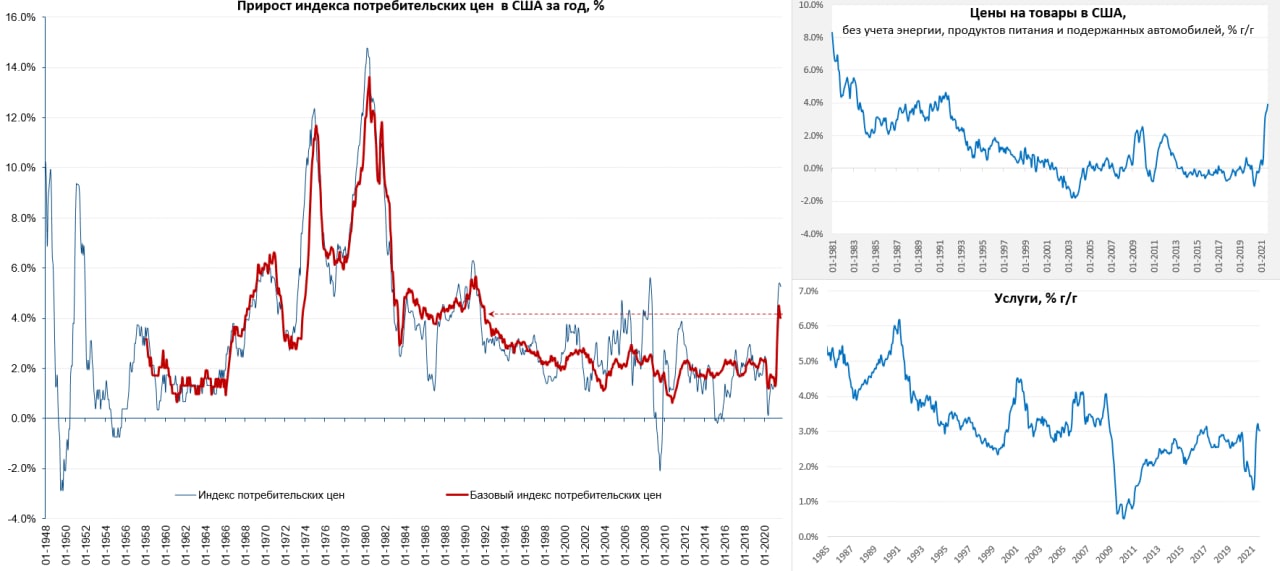 Большинство компаний практически во всех регионах США указывали на то, что рост закупочных цен немного замедлился (это следствие торможения ресурсных рынков), но рекордное количество компаний США говорят о повышении отпускных цен. Все это делает инфляцию в конкретном месяце малопредсказуемой… но общий инфляционный фон позволяет ждать инфляцию более 5% на конец года и ускорения роста базовой инфляции. Среднесрочно инфляция становится более устойчивой ...
