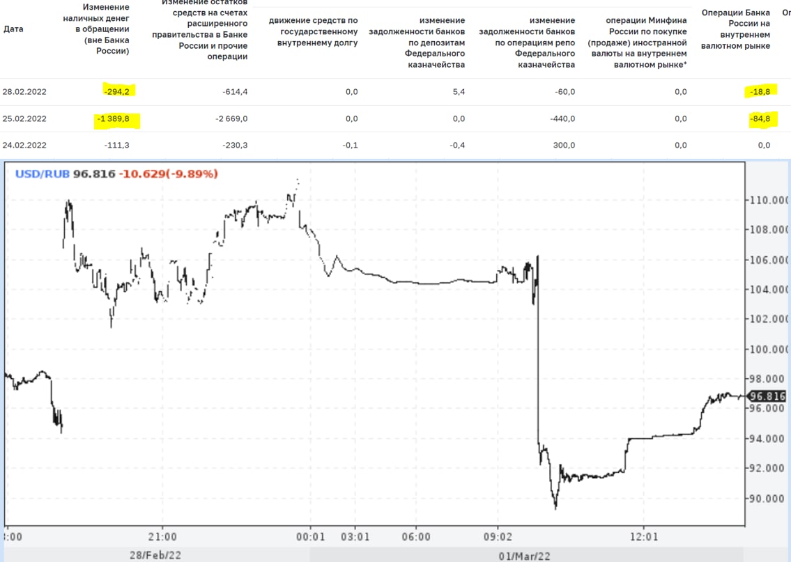 Отток рублей в кэш все еще высок, но постепенно начинает остывать, за последний день вынесли уже всего 211 млрд руб. – это говорит о том, что забег начинает выдыхаться. Всего за 6 рабочих дней население вынесло 2.6 трлн руб. При этом, структурный дефицит ликвидности + корсчет в ЦБ указывают на то, что банки взяли у ЦБ около 6.3 трлн на этот забег. Но сегодня банки уже активно возвращали ликвидность, правда с коррсчетов, пик дефицита рублевой ликвидности был два дня назад. Около 3.6 трлн ушло обратно в ЦБ, видимо на покупку наличной валюты у него (средний курс за эти дни ровно 100 руб./долл.)... но за последний день эта сумма практически не поменялась. Это значит вынесли скорее всего до половины наличности ЦБ (нижняя оценка на начало кризиса у меня $70 млрд...). При этом нужно учесть, что, помимо этого, в кассах банков было не менее $17 млрд, ну и самолеты с кэшем тоже летят, хотя и часть поставщиков закрыта, а ЕС запрещает везти наличные евро. Но, так, или иначе валюты вынесли больше, чем рублей и существенно.