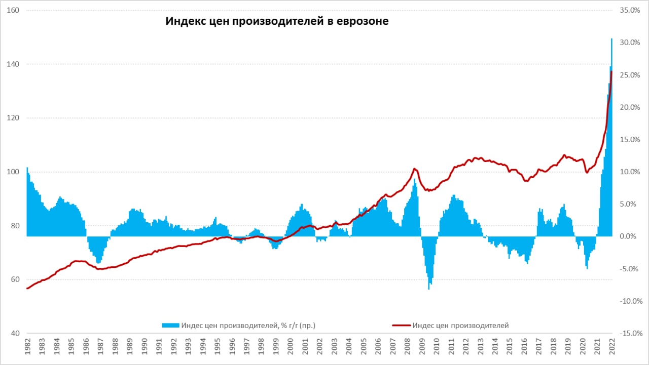 Уже в январе, еще до того, как сложилась вся текущая повестка, ситуация с инфляцией в еврозоне стала беспрецедентной. Сегодня вышли данные по динамике цен производителей в январе, рост цен составил 5.2% м/м – это второй по величине месячный прирост цен производителей за последние 40 лет, рекорд был поставлен совсем недавно в октябре (5.4% м/м).