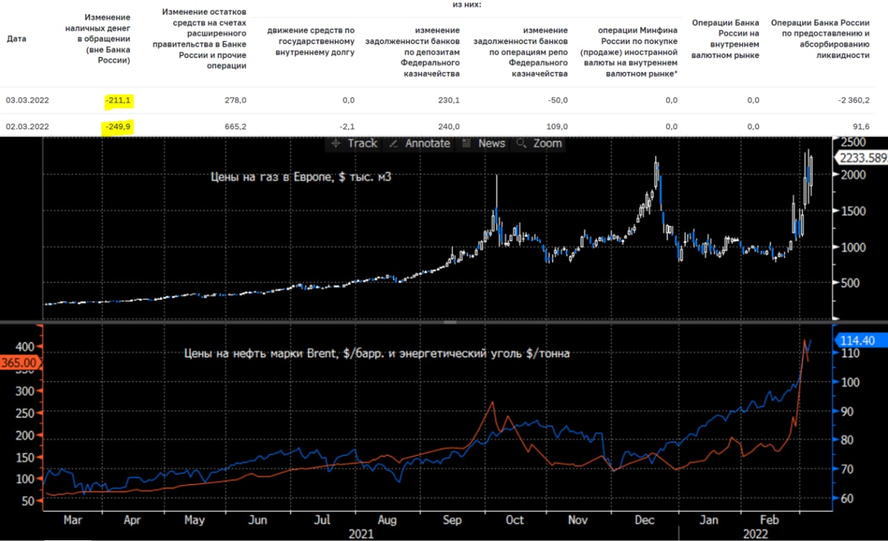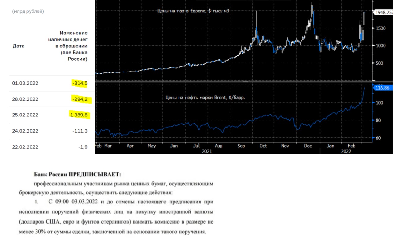 Банк России опубликовал рад объяснений по применению ограничительных мер – моно посмотреть здесь, продолжал вводить послабления для банков и прочие меры поддержки https://cbr.ru/support_measures/. Одновременно продолжая закручивать гайки – покупки физиками валюты на бирже теперь будут сопровождаться комиссией 30%, т.е. фактически введена запретительная мера покупки валюты через брокерские счета. Локально это правильная мера, но 30% все-таки перестарались, по-хорошему чтобы ограничить спекуляции нужно "разжать" спред вверх от рыночной цены... Население продолжало выносить рубли из банков, но темп выноса в последние дни около 300 млрд. руб. в день – некритично (тем более на фоне вбросов относительно Сбера и Райффа, которые разгоняли панику). На внебиржевом рынке рубль прилично укрепляется... в целом динамика указывает на, как минимум, локальную нормализацию курса. Есть сигналы от банков о большом притоке рублей и валюты на счета, посмотрим ...