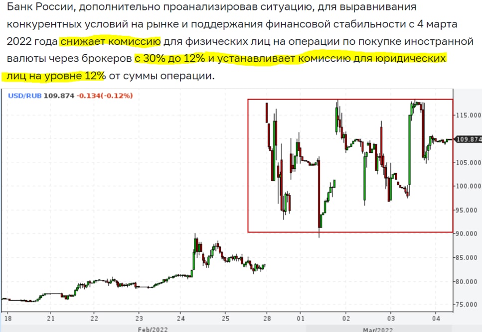 Банк России снизил комиссию по покупки валюты на бирже для физлиц до 12% и добавил юрлиц, решение о введении комиссии в 30%, видимо, стало одной из причин падения рубля в четверг. Суть в том, что когда вы вводите запретительную комиссию для одного сегмента рынка, другой этим может воспользоваться и это, похоже, произошло вчера. В итоге Банку России пришлось корректировать решение...