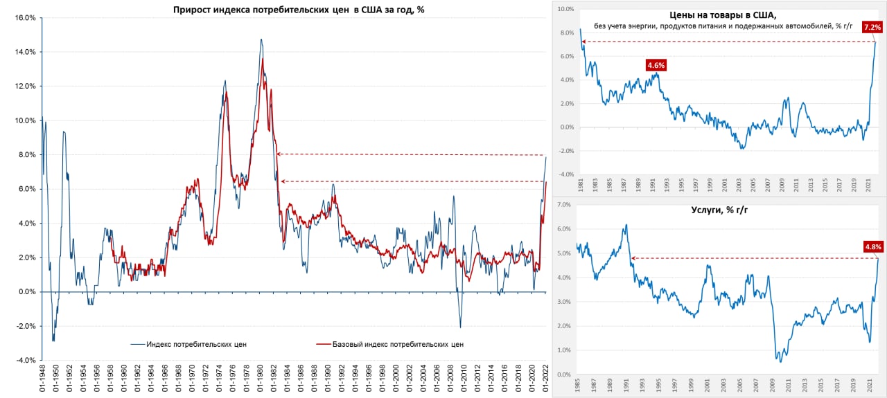 Причем, скорее всего, это еще не предел, потребительские цены в США выросли на 0.8% м/м и 7.9% г/г. Продукты питания подорожали на 1.0% м/м и 7.9% г/г – еда дорожает рекордными темпами за 40+ лет. Понятно, значительно подскочили цены на бензин в США 6.6% м/м и 38% г/г. Почти половина месячной инфляции – это продукты и бензин.