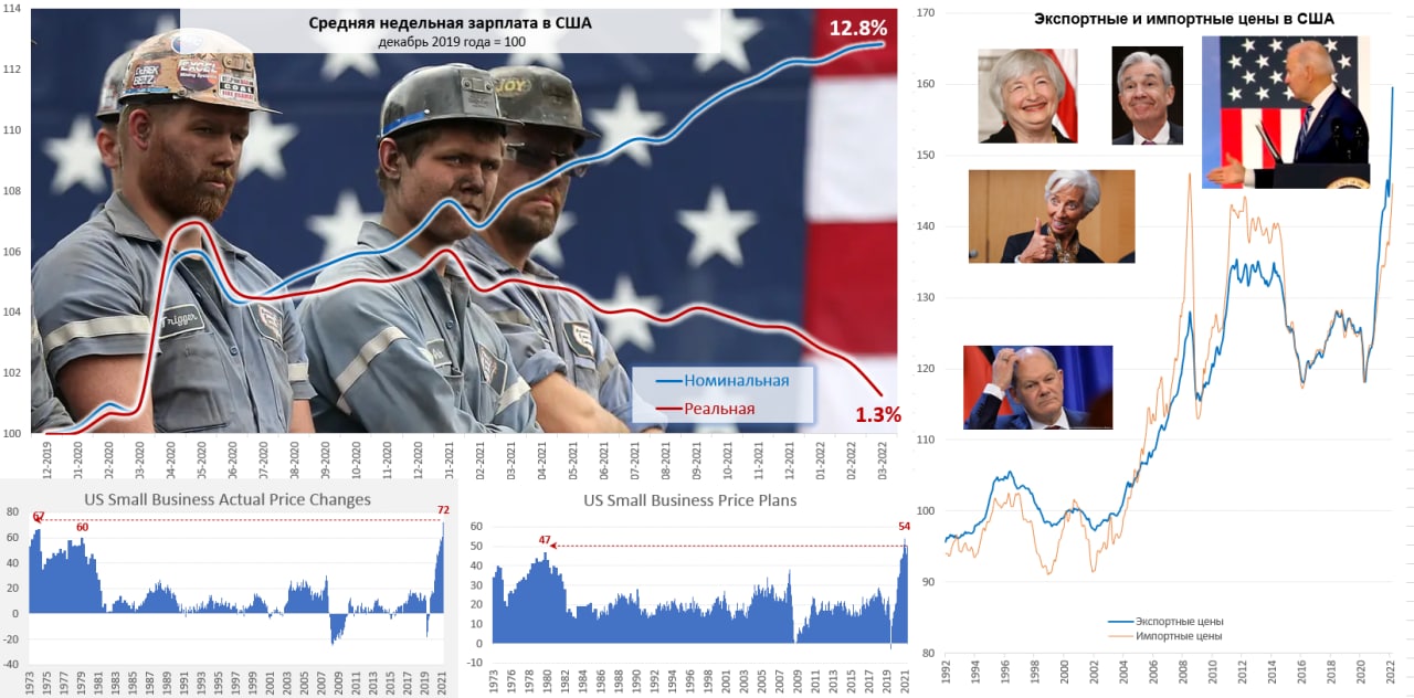 Весте с тем, реальные зарплаты американцев практически вернулись к докризисному уровню и всего на 1.3% теперь выше уровня декабря 2019 года, номинальные на 12.8% выше. В условиях дефицита на рынке труда работники будут требовать более активного повышения з/п, что может только ускорить инфляцию. Тем более, что малый бизнес продолжает агрессивно повышать цены, индекс текущего повышения цен в марте был перебил все рекорды 70-х, а планы повышения цен близки к рекорду. В целом это обещает рост внутренних цен и издержек...