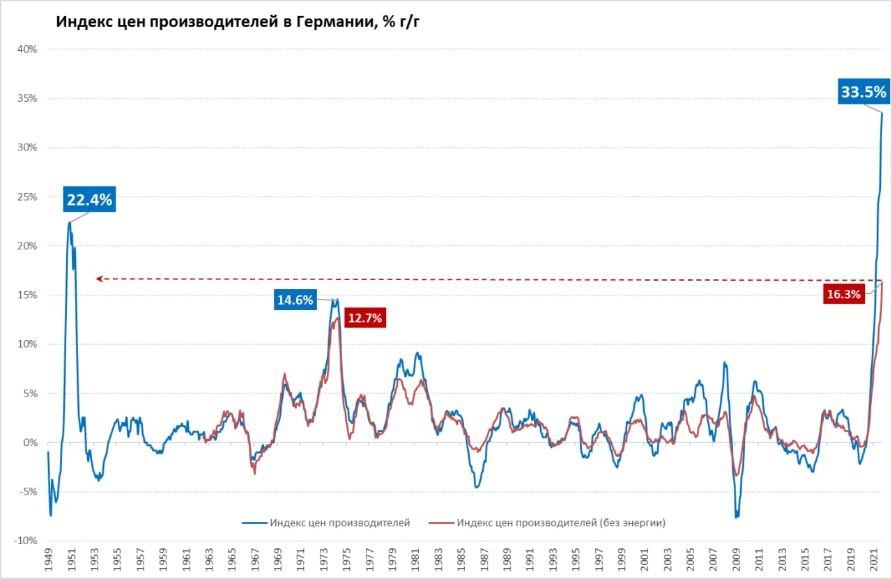 Цены производителей в Германии за апрель выросли еще на 2.8% м/м, а годовой прирост цен составил 33.5% г/г – это в полтора раза выше рекорда 1970-х годов и является самым высоким годовым темпом роста с начала ведения статистики в 1949 году. Без учета энергии цены также фиксировали агрессивный рост на 3.0% м/м (новый рекорд) и 16.3% г/г – это тоже исторический рекорд за все время ведения статистики, до сих пор максимумы были в 1974 году на уровне 12.7% г/г. В апреле энергия не стала главным драйвером роста цен производителей, т.к. цены на нефтепродукты корректировались.