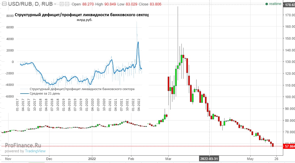 Укрепление рубля, конечно, провоцирует ожидания продолжения этой динамики (при текущем профиците внешней торговли это не удивительно), но, думается, что в июне этот процесс вряд ли продолжится. Во-первых будет нарастать бюджетный дефицит, во-вторых в июне истекает значительная часть из 2.76 трлн рублевых депозитов (часть из которых вернется в валюту), открытых в марте по ставке 20%+, в третьих рублевая ставка еще снизится. При этом, я не думаю, что какое-то сильное влияние окажет снижение нормы продажи выручки до 50%, т.к. компаниям накапливать на счетах валюту объективно некомфортно, а конвертировать при текущем курсе и выросших ценах на поддержание операционной деятельности и налоги приходится больше.