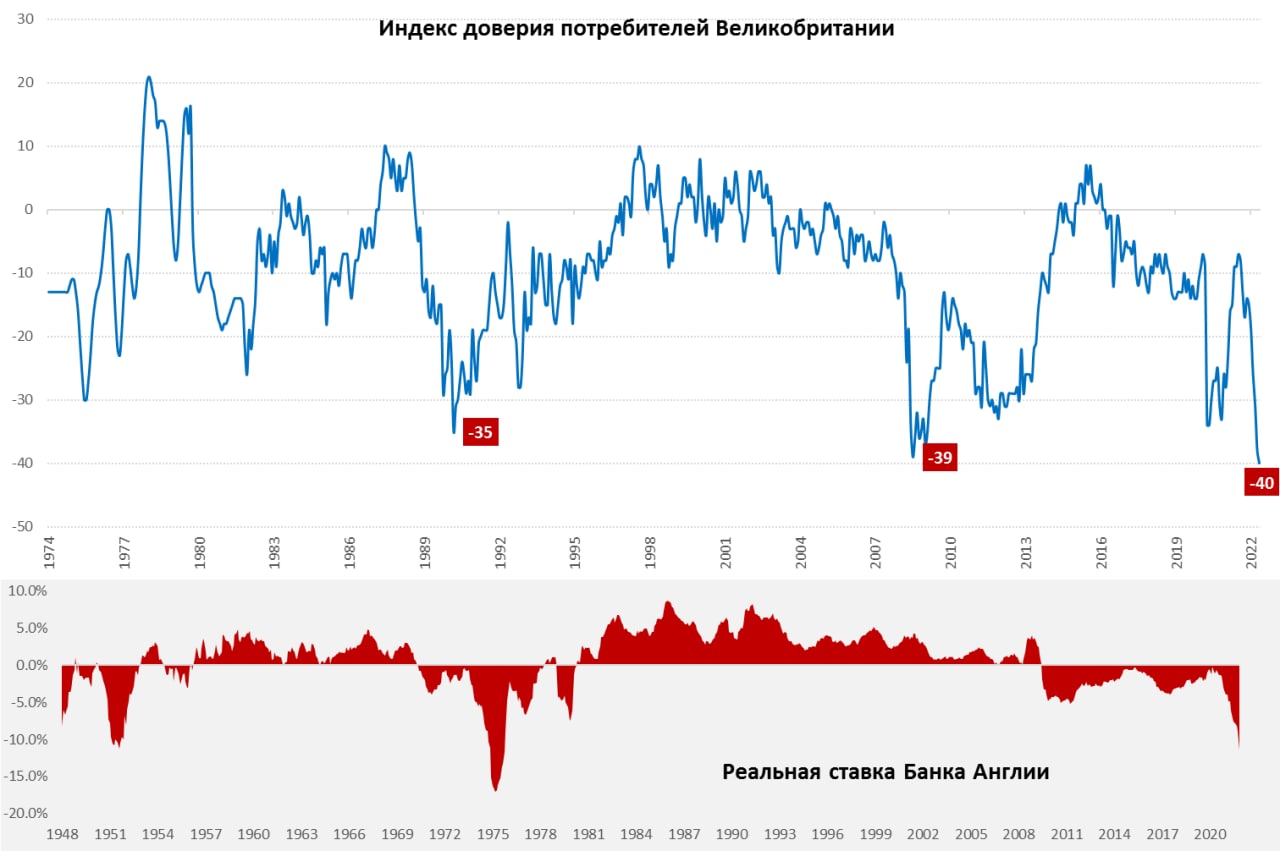 Британский потребитель давно уже не в лучшем настроении, но, увидев майские счета, совсем приуныл – индекс доверия потребителей снизился до -40, что произошло впервые за все время ведения статистики с 1974 года. Хотя с инфляцией полвека назад было даже повеселее – рост розничных цен к осени 1975 года достигал 26.9% г/г, а курс фунта с 1973 по 1985 годы рухнул в два захода с 2.4 до 1.08 долл./фунт после волкеровского укрощения инфляции вернуть фунт чуть выше помогло только соглашение Плаза 1985 года и синхронная девальвация доллара, т.е. дружная девальвация доллара. Сейчас все поскромнее – розничные цены растут всего на 11.1% г/г, фунт присел к 1.22 доллара за фунт, правда и доллар уже не тот – нет на него Пола Волкера.
