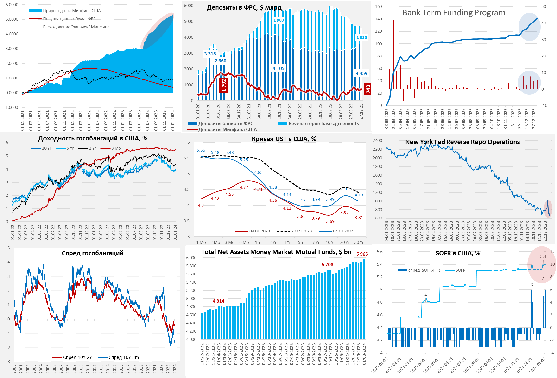 Скорее это стоит связывать с колебаниями ликвидности, под закрытие года традиционно в обратное РЕПО с ФРБ Нью-Йорка ушло более $200 млрд, а объем RRP превысил $1 трлн в моменте. Но это известные регуляторные «однодневные» игры в последний отчётный день квартала года. Обычно рынок такое нормально переваривает, но здесь добавили также приличные чистые займы Минфина США - c 28 декабря по 2 января около $94 млрд (госдолг превысил $34 трлн).