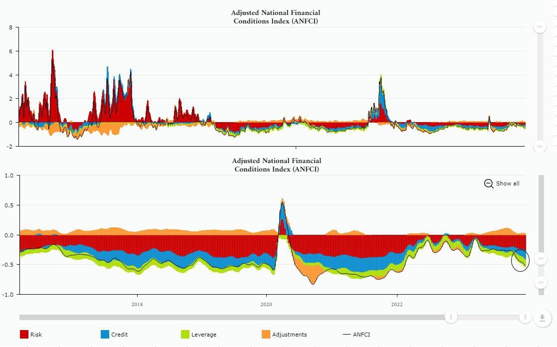 На деле ФРС своей политикой скупки активов (QE) существенно снизила эффективность ужесточения ДКП, щедрость бюджета тоже сыграла свою роль, в итоге финансовые условия остались мягкими, несмотря на агрессивное повышение ставок. Хотя кредитные риски от повышения ставок (рост неплатежеспособности клиентов) еще впереди – просрочки растут, хотя может и здесь Йеллен подкинет денег …? Хотя делать ей это будет сложно, учитывая стремительный рост расходов на обслуживание долга.