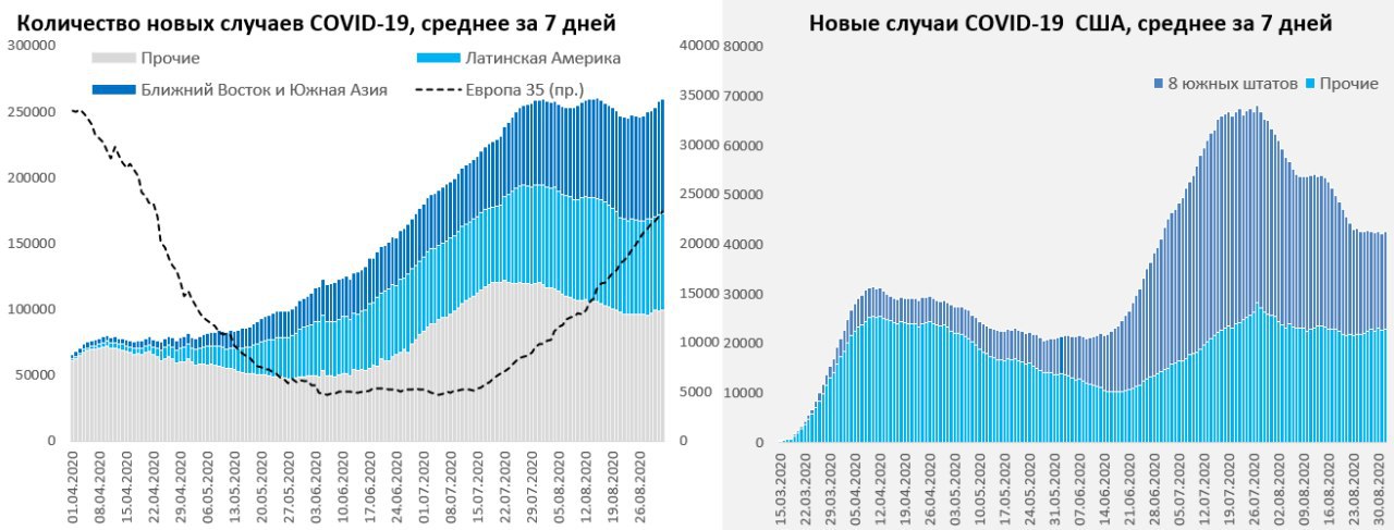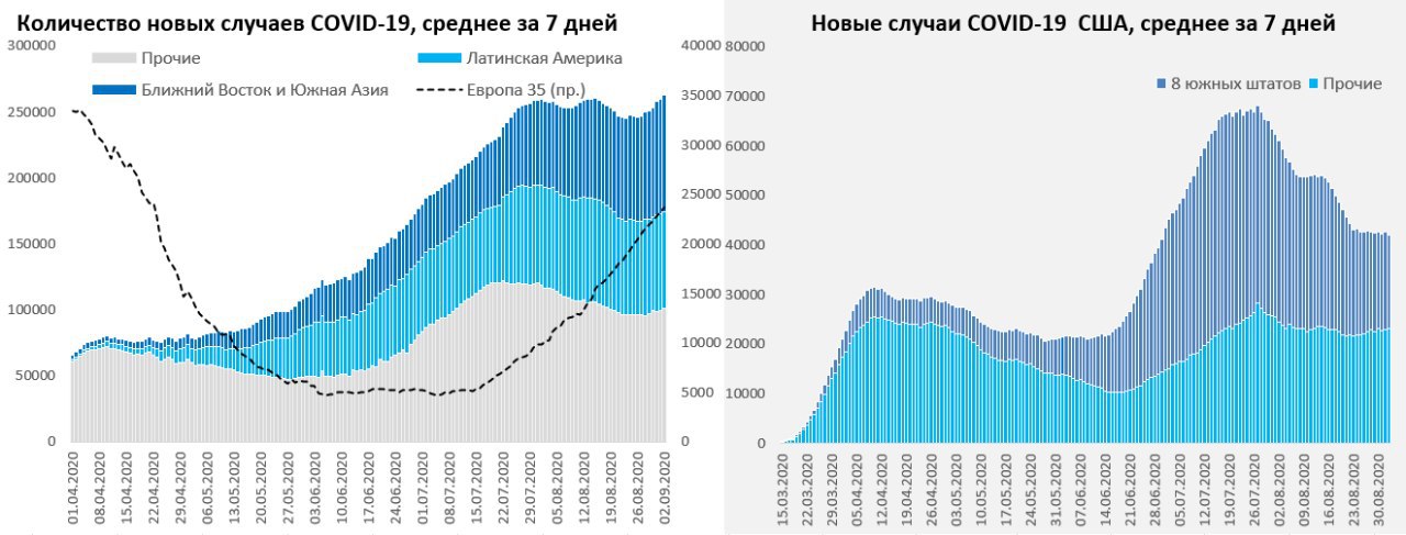 В мире среднее за 7 дней количество новых случаев продолжило расти. Индия побила все рекорды, количество новых случаев уже около 80 тыс. в день, среднее за неделю выше 70 тыс., в лидерах по приросту новых случаев и Индонезия. Западная Европа продолжает активный рост, в лидерах Франция с Испанией и Италией, начинает активней прибавлять Великобритания.