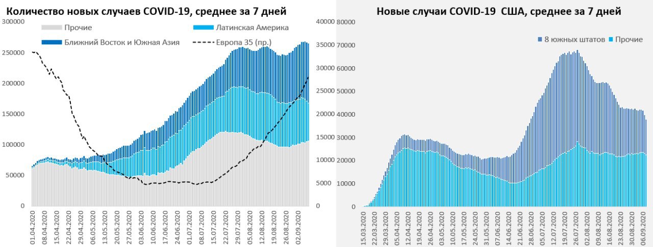 В мире среднее за 7 дней количество новых случаев продолжало расти. Индия уверенно подходит к 80 тыс. в день, новые рекорды ставит и Индонезия. Западная Европа продолжает планомерный рост за счет Испании и Франции, Британия медленно ускоряется.