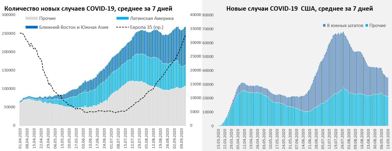 В мире среднее за 7 дней количество новых случаев продолжало расти. Индия уверенно подходит к 80 тыс. в день, новые рекорды ставит и Индонезия. Западная Европа продолжает планомерный рост за счет Испании и Франции, Британия медленно ускоряется.
