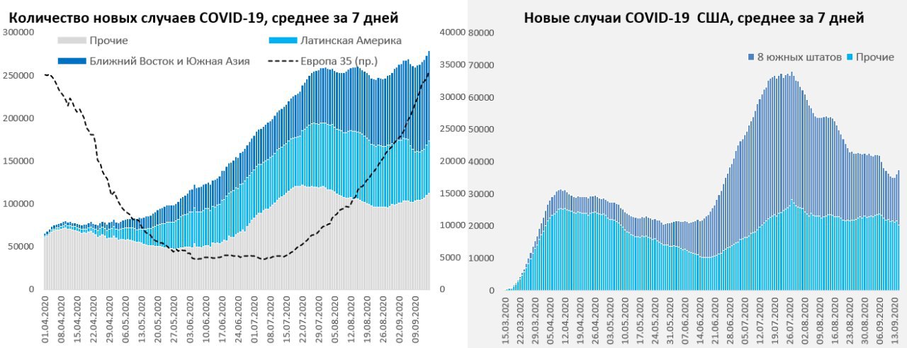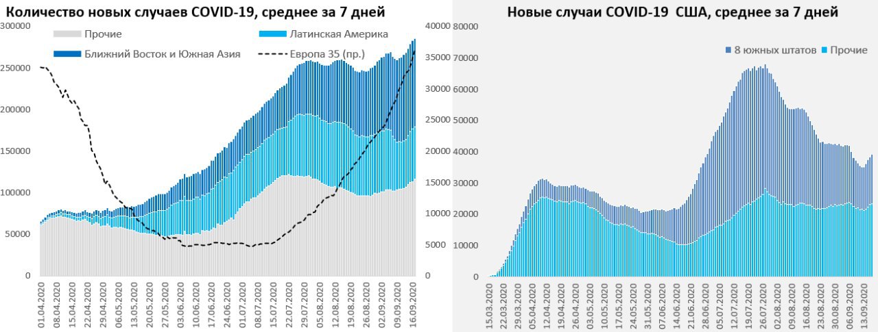 В целом по миру снова возобновился рост новых случаев, хотя динамика остается неравномерной. Индия в среднем за 7 дней выдает стабильно более 90 тыс. новых случаев. Рост в Израиле привел к вводу нового общенационального карантина. Западная Европа по количеству новых случаев приближается к рекордам весны. В лидерах Испания (~10 тыс.) и Франция (~ 8 тыс.), но в Испании темп роста замедляется. Стремительно набирает Великобритания, взрывной рост в Чехии. В целом активный рост новых случаев, но достаточно низкая смертность (правда и здесь цифры начинают подрастать).