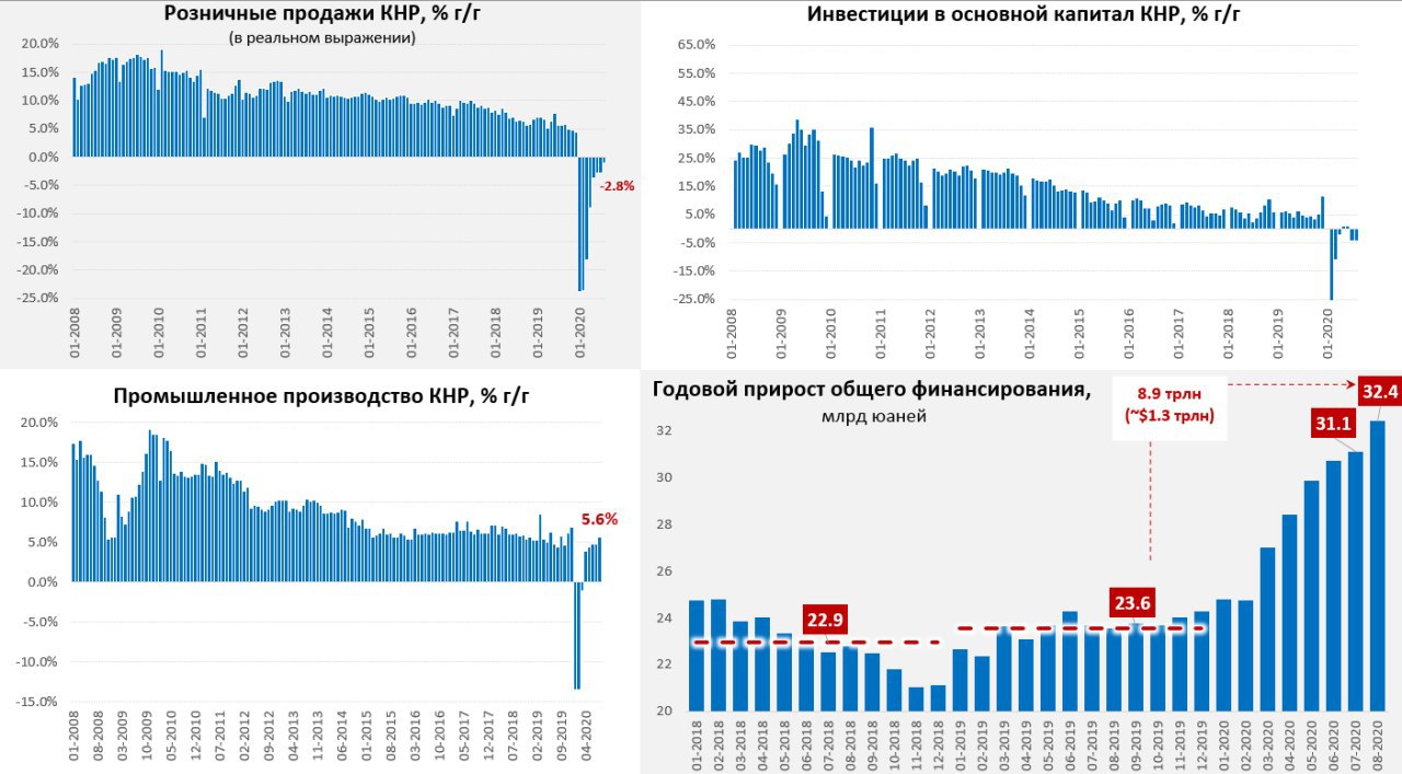 Инфляция в Китае немного снизилась и составила 2.4% г/г против 2.7% г/г в июле, но пока инфляция остается выше ставки РЕПО (~2.2%), которая становится основной в денежно-кредитной политике, так что реальные ставки отрицательны. Цены производителей пока в дефляции (-2%). В августе резко выросли объемы долгового финансирования экономики, что и является основным инструментом поддержки сейчас. Общие объемы финансирования прибавили 3.6 трлн юаней (~$0.5 трлн), что существенно больше уровней августа прошлого года (2.2 трлн юаней) и уровней июля (1.7 трлн юаней). Китай по-прежнему «вытаскивает» ситуацию за счет активного наращивания долга, всего за 12 месяцев прирост объемов финансирования составил 32.6 трлн, что на 8.9 трлн ($1.3 трлн) больше, чем в 2019 году. Общие объемы финансирования достигли 276.7 трлн юаней, или почти $40 трлн (~ 280% ВВП). Основной рост долга в августе был сосредоточен в госсекторе (выпуск гособлигаций), которые, видимо, выкупались банковским сектором. Потрачено было не все, часть осталось на счетах правительства в ЦБ, но все же чистый выпуск госдолга в объеме 1.38 трлн юаней (~$200 млрд) – это рекордный месячный объем за всю историю.