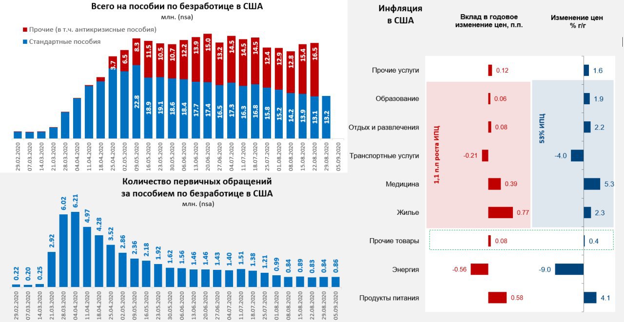 Первичные заявки на пособие по безработице замерли в районе 800-900 тыс. в неделю, на стандартных пособиях по безработице остается 13.2 млн человек. А вот общее количество американцев на пособии по безработице даже немного подросло и составило 29.6 млн человек к 22 августа. Это жестко диссонирует с официальными данными по количеству безработных, которых всего 13.6 млн человек. В этом плане официальный уровень безработицы в США сейчас – это малоинформативный показатель. Данные по отработанным часам в малом и среднем бизнесе указывают на то, что последние два месяца рынок труда США скорее в состоянии стагнации, подтверждая скорее данные по заявкам на пособия. При этом, выплаты дополнительных пособий по безработице сократились в августе боле, чем в 2 раза.