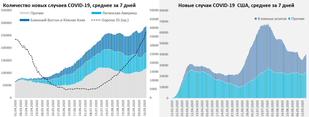 В целом по миру снова возобновился рост новых случаев, хотя динамика остается неравномерной. Индия в среднем за 7 дней выдает стабильно более 90 тыс. новых случаев. Рост в Израиле привел к вводу нового общенационального карантина. Западная Европа по количеству новых случаев приближается к рекордам весны. В лидерах Испания (~10 тыс.) и Франция (~ 8 тыс.), но в Испании темп роста замедляется. Стремительно набирает Великобритания, взрывной рост в Чехии. В целом активный рост новых случаев, но достаточно низкая смертность (правда и здесь цифры начинают подрастать).
