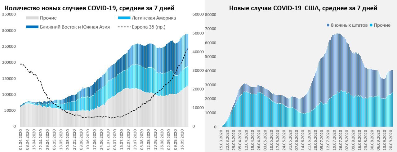 Суточный прирост выявленных случаев COVID-19 в России активно растет и составил 7212 - максимум за 3 месяца, общее количество случаев достигло 1.136 млн. В Москве количество новых случаев подскочило до 1560 человек – максимум за 3.5 месяца. Власти Москвы призвали перевести людей на удаленную работу, ограничить активность пожилых и указали на рост госпитализаций. По России без Москвы количество новых случаев составило 5.65 тыс., а среднее за 7 дней уверенно растет. В Москве был всплеск тестирования в первой половине сентября, что может быть обусловлено возвращением из отпусков (многие работодатели проводят тестирование после отпуска и небольшого карантина 1-2 недели). Среднее за 7 дней количество новых случаев в Москве подскочило выше 1 тыс. в день.