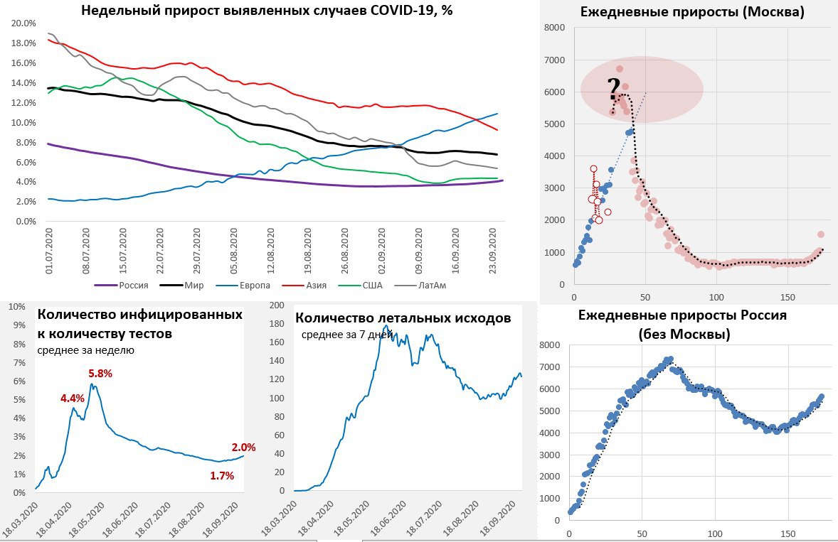 Суточный прирост выявленных случаев COVID-19 в России уверенно прибавляет и составил 6431 - максимум с середины июля, а общее количество случаев достигло 1.122 млн. В Москве количество новых случаев 970 человек, в последнее время здесь почти все цифры заканчиваются на ноль, считаем с точностью до десятка. По России без Москвы количество новых случаев составило 5.46 тыс., а среднее за 7 дней уверенно растет, количество случаев растет и относительно тестов (особенно в Москве в последнюю неделю), уже более 2 недель растет смертность. Осень не радует...