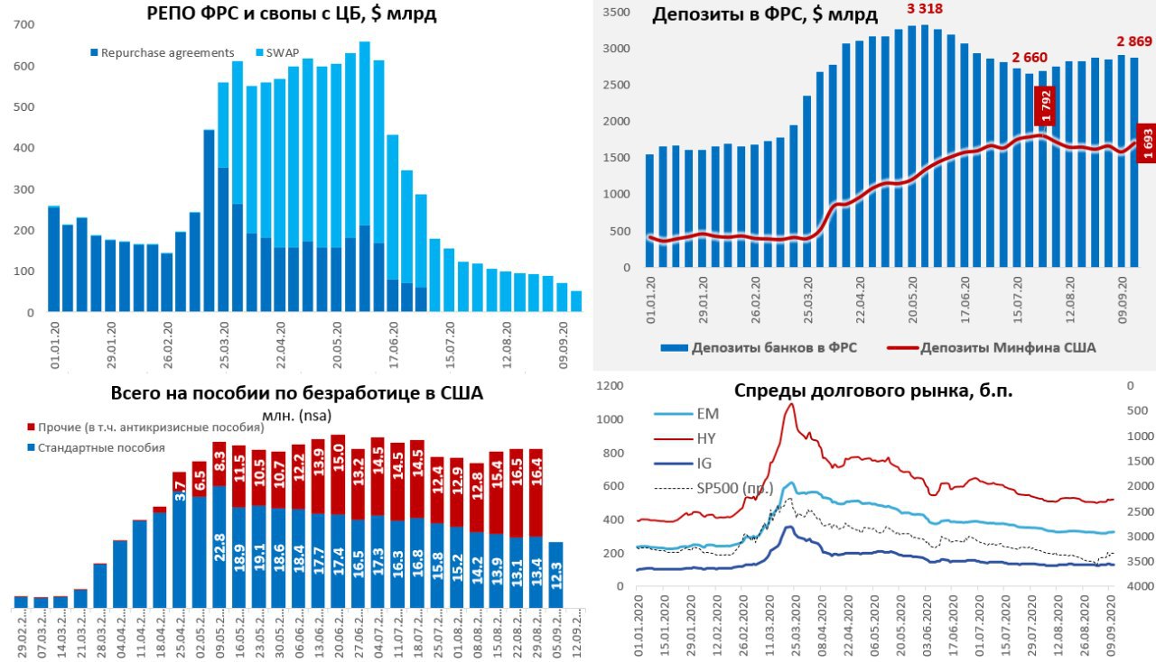 Заседание ФРС принесло лишь небольшие уточнения будущей политики регулятора. Прогноз по росту ВВП в 2020 году пересмотрен вверх, прогнозы на 2021-2022 годы немного понижены. Одновременно ФРС указывает на крайне высокую неопределенность и непредсказуемость экономической ситуации в связи с COVID-19. Прогнозы по безработице понижены, в 2023 году ФРС ожидает ее близкой к долгосрочной цели (4.0%), также прогнозируется возврат к цели и инфляции. Но, т.к. стратегия пересмотрена и таргетируется средняя инфляция – то ФРС не планирует повышать ставку и до 2024 года и оставит ее на нулевом уровне. Комментарии ФРС предполагают повышение ставки лишь тогда, когда инфляция будет некоторое время превышать 2%. Показатель безработицы – это не единственная цель по занятости, будет учитываться коэффициент участия в рабочей силе (не прошло и пяти лет), зарплаты и прочее. Из высказываний ФРС - они вряд ли повысят ставку ранее, чем через 4-5 лет. Регулятор продолжит покупать облигации на $120 млрд и более (если потребуется) ежемесячно, чтобы «способствовать созданию благоприятных финансовых условий».