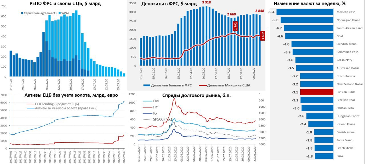 ФРС на неделе снова нарастила активы, несмотря на сокращение своп-линий с другими ЦБ. За неделю до 23 сентября было куплено гособлигаций на $24.5 млрд, еще на $19.8 млрд пришло ипотечных облигаций, но свопы с иностранными ЦБ сократились на $20.3 млрд (свопов осталось всего на $32 млрд). По итогам недели активы ФРС выросли на $28.7 млрд до $7.093 трлн.