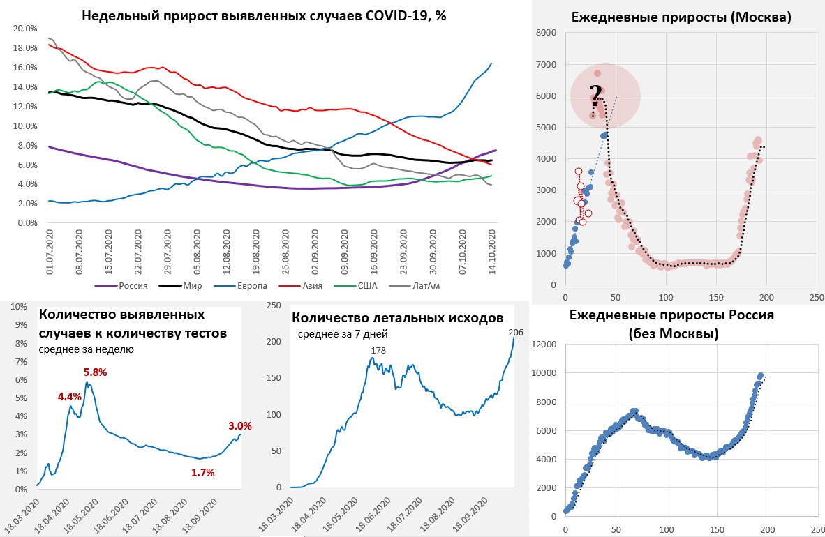 Суточный прирост выявленных случаев COVID-19 в России немного составил 15099 случаев, общее количество случаев составило 1.399 млн. Москва зафиксировала 4610 новых случаев, госпитализации около 1-1.2 тыс. ежедневно. По России без Москвы количество новых случаев поставило новый рекорд 10.49 тыс. Смертность ставит новые рекорды, рост количества новых случаев опережает рост тестов.