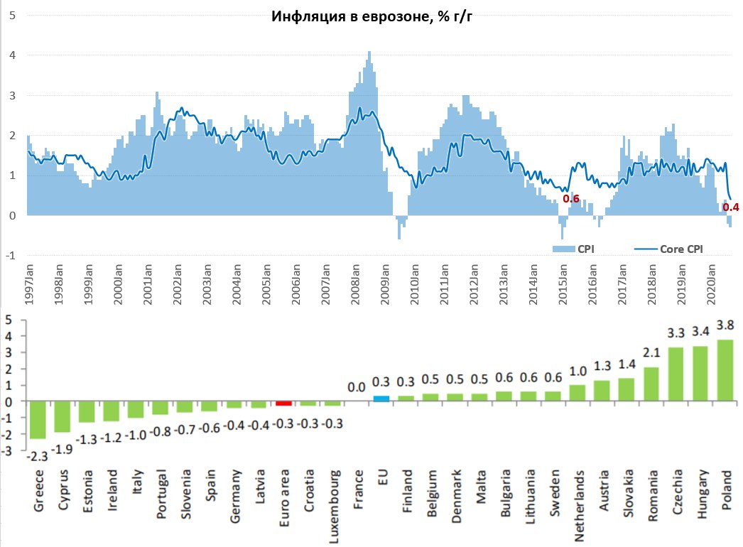Потребительские цены в еврозоне по данным Евростата за сентябрь хоть и выросли на 0.1% м/м, но годовая динамика составила -0.3% за год. Но более интересна здесь базовая инфляция без учета энергии и продуктов питания годовой рост цен снизился до 0.4%, пробив минимумы 2015 года и установив новый исторический минимум. Большинство стран крайне далеки от цели ЕЦБ по инфляции, потому предстоит сильно постараться, чтобы хоть как-то приблизиться к целям.