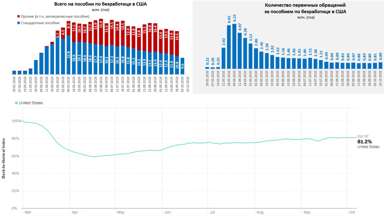 Первичные обращения за пособием по безработице в США за неделю немного (в масштабе изменений последних месяцев) прибавили и составили 886 тыс. (nsa) – это максимум за 8 недель, но все же в рамках изменений, которые мы видели в последние месяцы. А вот количество фактически получающих пособие американцев стандартной схеме продолжает сокращаться, еще -1.2 млн до 9.6 млн за неделю до 3 октября. Всего же на пособиях, в т.ч антикризисных все еще более 25 млн американцев было к концу сентября. Сокращение регулярных пособий связано с тем, что просто истекают сроки выплат самих пособий для тех, кто в первых рядах их получал и часть из них перемещается в «дополнительные» (но далеко не все).