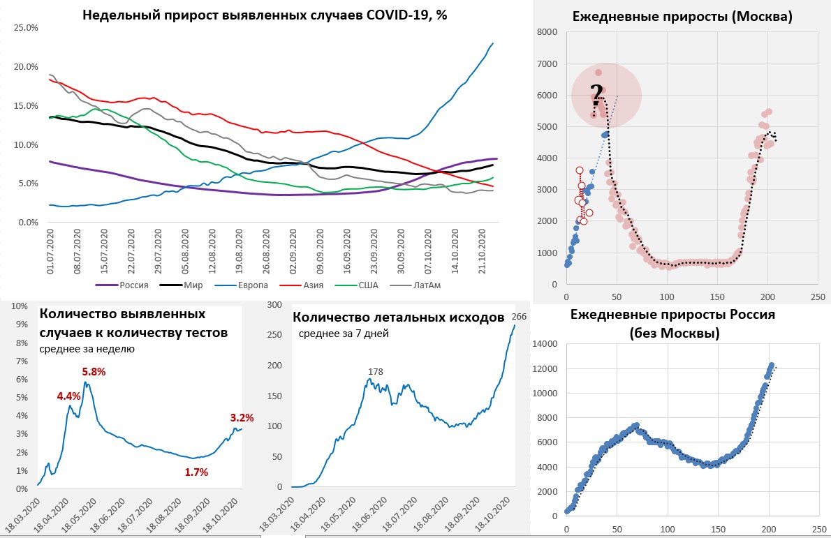 Динамика в мире продолжает оставаться восходящей, количество новых случаев растет на 20% в неделю. В Индии и Израиле все еще ситуация улучшается, нормализуется ситуация в Ирландии. Западная Европа продолжает уверенное движение по достаточно крутой экспоненте (с локальным спадом случаев после выходных), но пока медицина справляется и смертность находится в районе 1%. Франция в лидерах – новые случаи растут в 1.5 раза за неделю. В Восточной Европе ситуация сложная – в лидерах Польша и Чехия.