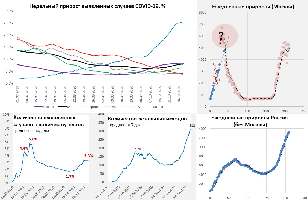 Количество новых случаев в мире продолжает стремительный рост и уже уверенно выше 0.5 млн в день. В Индии ситуация улучшается, нормализуется ситуация в Ирландии. Западная Европа вводит одно за другим ограничения, но пока – рост новых случаев продолжается. По количеству новых случаев Франция остается лидером, продолжается разгон в Италии, Бельгии Испании и Германии, торможение в Великобритании и Нидерландах. Смертность относительно низкая, но растет. Польша уже перешагнула через отметку 20 тыс. в день, Чехия притормозила.