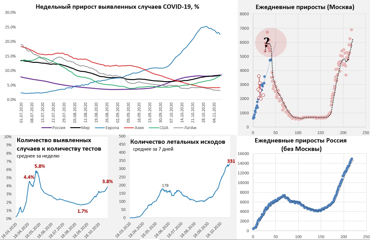 В США продолжается рост среднего за неделю количества новых случаев, рост продолжает ускоряться. Количество госпитализированных в США растет на 9 тыс. в неделю рекорды дело нескольких дней. Рост смертности традиционно притормозил в выходные, доля положительных тестов в США превысила летние максимумы и составляет около 8%. В Латинской Америке ситуация пока позитивна.