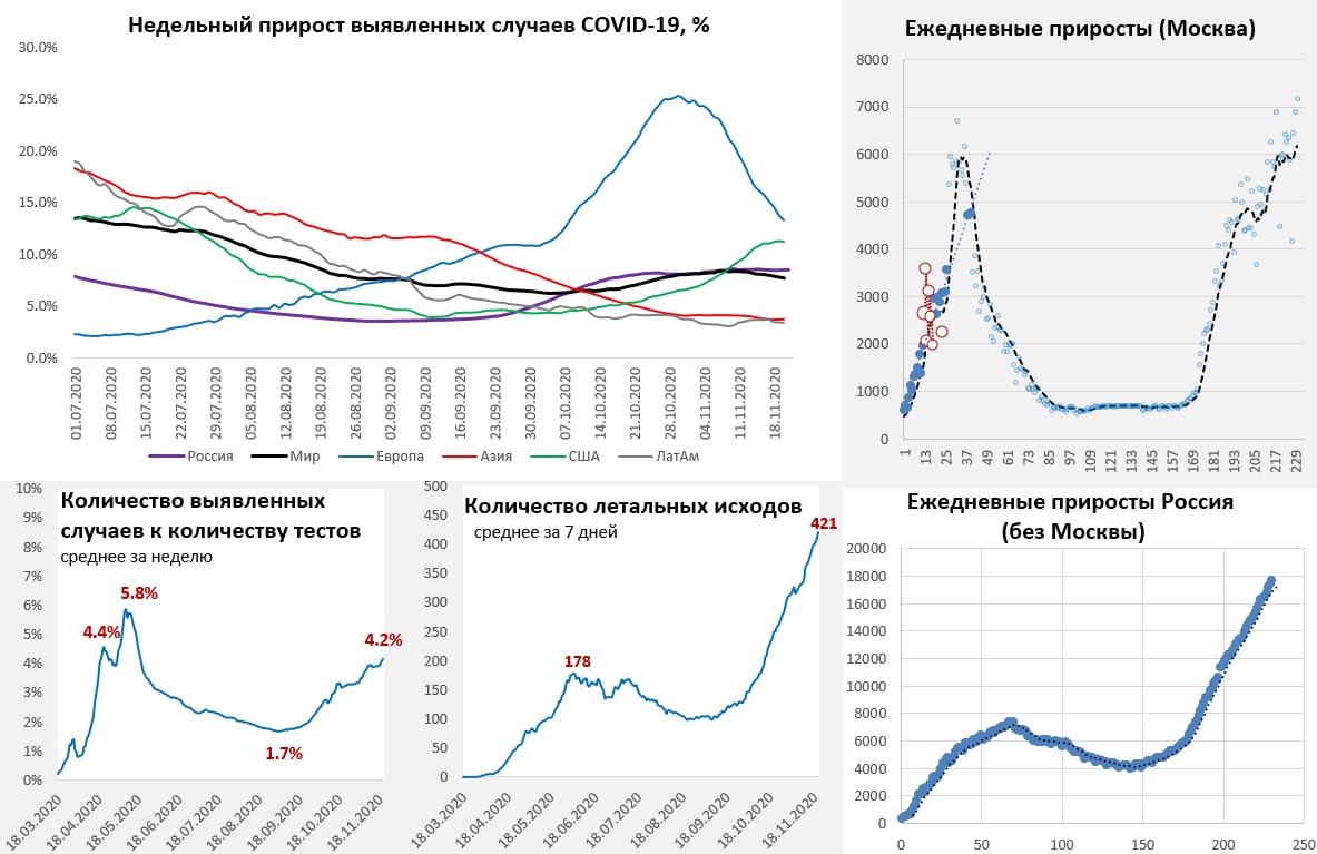 В России ухудшение продолжатся, идем к тому, чтобы вернуться на первое место в Европе. Москва и Санкт-Петербург – рекорд за рекордом. В День благодарения данные из США неполноценны, потому о динамике здесь говорить бессмысленно.