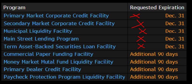 Уходящий министр финансов Стивен Мнучин выпустил письмо председателю ФРС Дж. Пауэллу о закрытии ряда программ поддержки экономики и попросил вернуть деньги. В ответ, буквально через несколько минут, ФРС призвала сохранить программы («Would Prefer» Emergency Lending Facilities Could Continue). Ради справедливости надо сказать, что большинство программ не полетело, выделенные ресурсы не востребованы и дополнительные деньги у ФРС брать не хотят. Поэтому мегапланы по вливанию в экономику до $1.8 трлн провалились. Единственным действенным инструментом вливания остается прямая покупка гособлигаций и ипотечных облигаций.