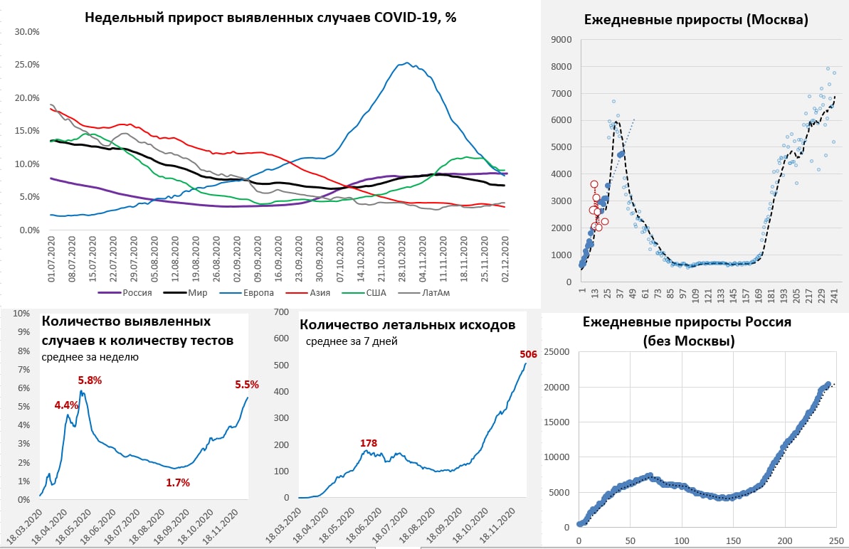В США ухудшение по всем показателям, Лос-Анжелес пошел на ужесточение ограничений. Германия продлевает изоляцию до 10 января. Великобритания первой одобрила вакцину и готовится к массовой вакцинации. В Москве снова горки …