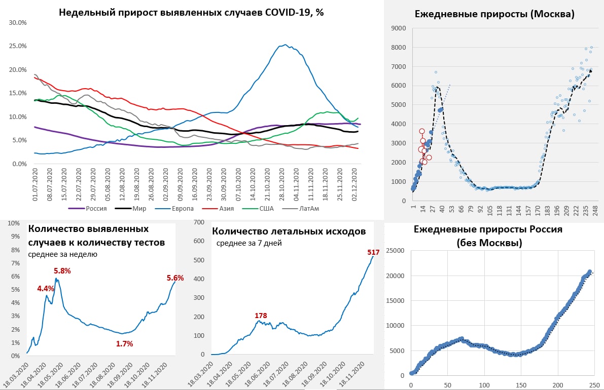 В США – взлет ускоряется, где будет остановка пока не очень понятно, но видимо не раньше 250-300 тыс. случаев в день. Смертность удерживается на максимумах и превысила уровни весны. Госпитализации продолжают расти, прибавляя каждую неделю более 10 тыс. Доля положительных тестов держится выше 10%. Негативной остается динамика в Канаде и Бразилии.
