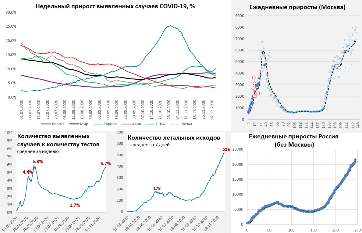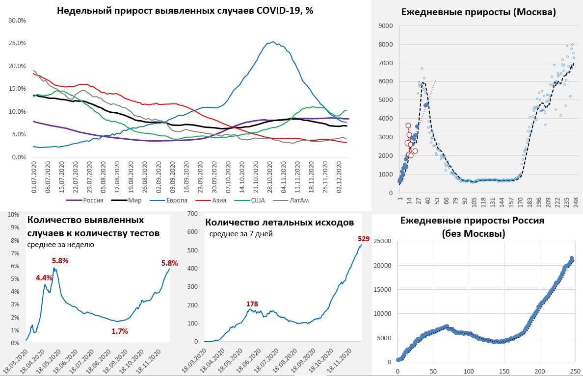 В США – взлет ускоряется, где будет остановка пока не очень понятно, но видимо не раньше 250-300 тыс. случаев в день. Смертность удерживается на максимумах и превысила уровни весны. Госпитализации продолжают расти, прибавляя каждую неделю более 10 тыс. Доля положительных тестов держится выше 10%. Негативной остается динамика в Канаде и Бразилии.
