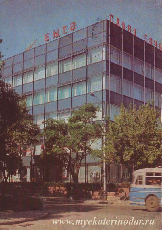 Центральная магистраль краевого центра украсилась еще одним пятиэтажным зданием. Сняты леса со строящегося на углу улиц Красной и Хакурате дома быта. Архитектурное исполнение его напоминает центральный универмаг «Краснодар». Железо и стекло — основные строительные материалы, использованные при постройке здания. Автор проекта — коллектив «Моспроект-4».