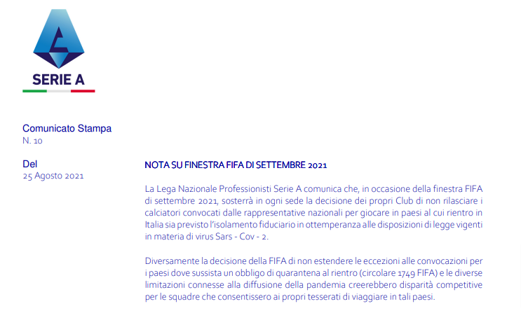 Сообщается, что Серия А присоединилась к АПЛ и Ла Лиге, не позволяя игрокам поехать на сентябрьские международные матчи. Для Аргентины это означает отсутствие Хуана Муссо, Науэля Молины, Мартинеса Куарта, Нико Домингеса, Х. Корреа, Николаса Гонсалеса, Лаутаро Мартинеса и Пауло Дибалы.