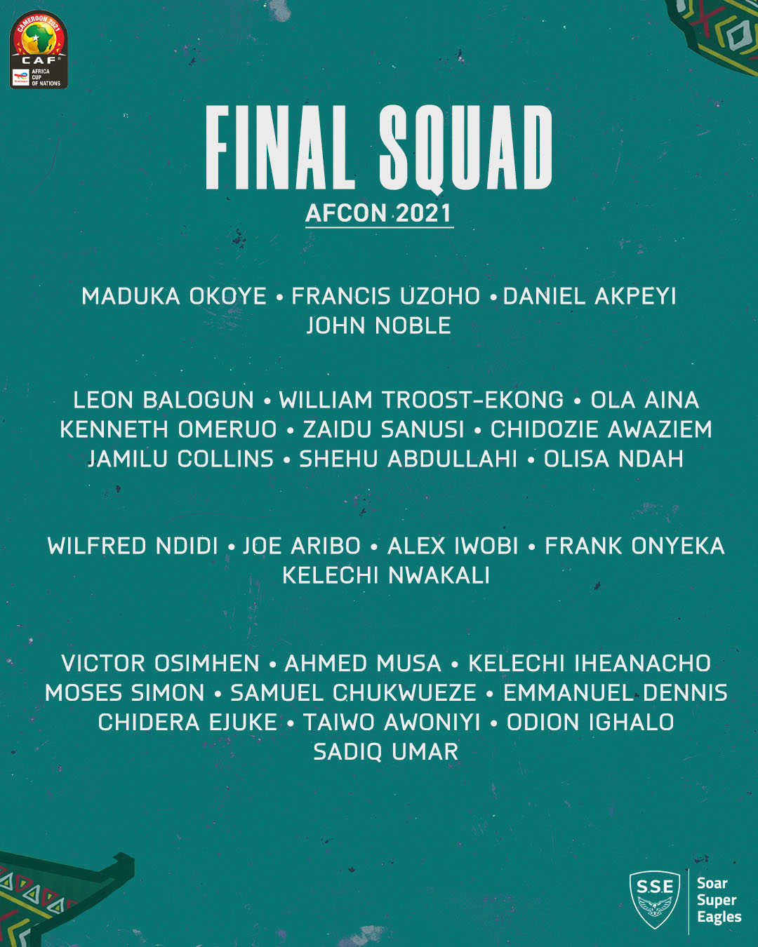 Кубок африканских наций 2021 состоится 9 января — 6 февраля 2022 года в Камеруне. Сборная Нигерии попала в группу D, в которой её соперниками будут Египет, Гвинея-Бисау и Судан.