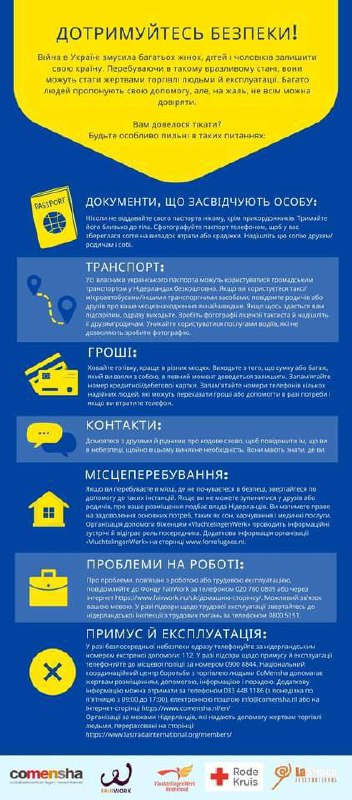 Війна в Україні змусила багатьох жінок, дітей і чоловіків залишити свою країну. Перебуваючи в такому вразливому стані, вони можуть стати жертвами торгівлі людьми й експлуатації. Багато людей пропонують свою допомогу, але, на жаль, не всім можна довіряти. Вам довелося тікати? Будьте особливо пильні в таких питаннях: