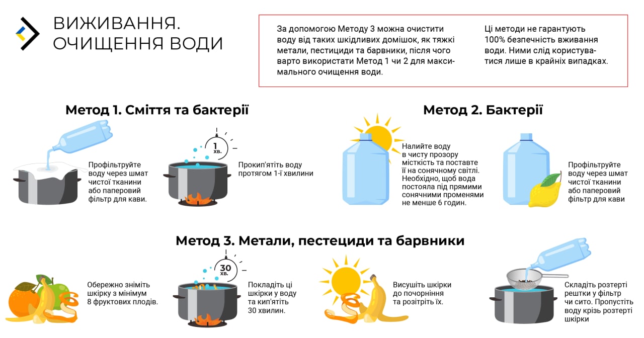 Пам'ятайте, що дані методи не гарантують 100% безпечність вживання води. Ними слід користуватися лише в крайніх випадках.