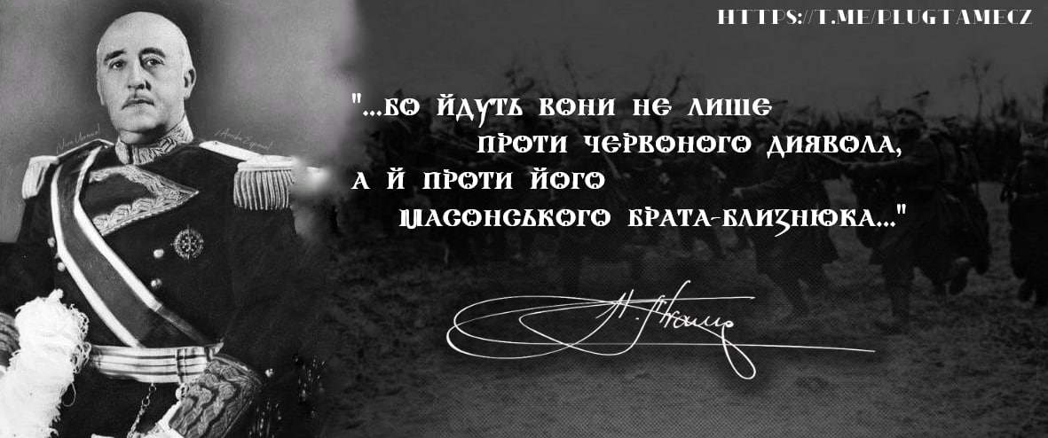 Ліберальна Антанта втопила в крові будь-які прагнення великої української нації до власної державності, а тепер Аліанти легітимізували комуністичне поневолення цього славного народу. Українці залишались і залишатимуться останніми захисниками Старої Європи від російського комуністичного сатани, і у своїй священній боротьбі проти цієї кровожерливої орди їм завжди прийдеться долати супротив західних демократій, бо вони йдуть на битву не лише проти червоного диявола, а й проти його масонського брата-близнюка”,