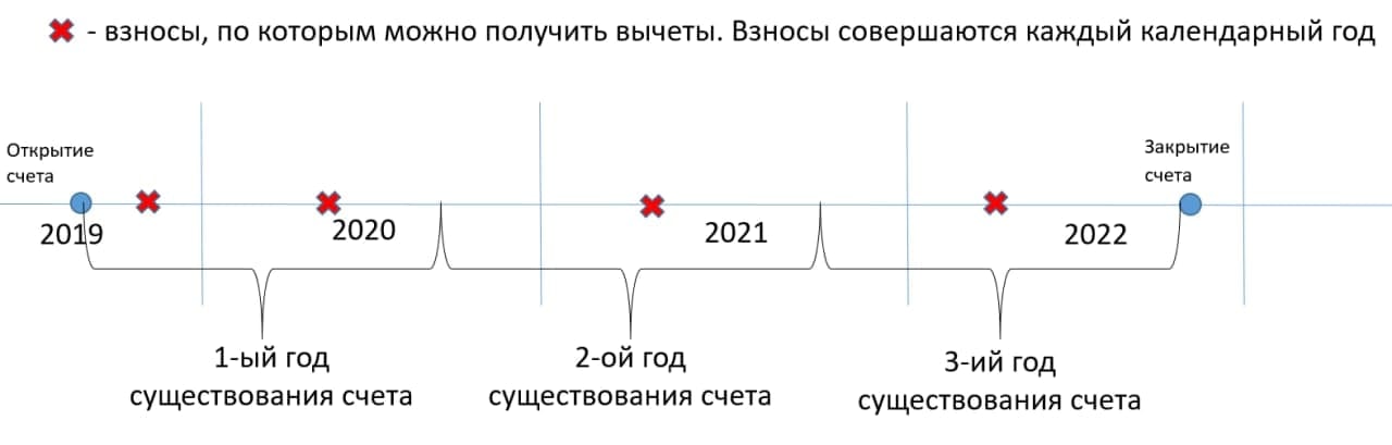 Существует мнение, что минимальный срок существования ИИС равен количеству вычетов, то бишь три года = три вычета. Это не совсем так. Допустим вы подписали заявление о присоединении к договору ведения ИИС 10 ноября 2019 года. По закону, чтобы не потерять право на вычет, вы можете закрыть счет не ранее 11 ноября 2022 года. Отсчёт идет именно с 10 ноября, а не с начала следующего календарного года, т.е. не с 1 января 2020 года. Соответственно, вы вправе закрыть ИИС 11 ноября 2022, а не ждать конца 2022 года. Получается, что три года существования ИИС захватывают четыре календарных года — 2019, 2020, 2021, 2022. А учитывая тот факт, что лимиты на взнос обновляются каждое 1-е января, можно сделать вывод, что в данном случае воспользоваться вычетом можно четыре раза. Подробнее - на картинке👇