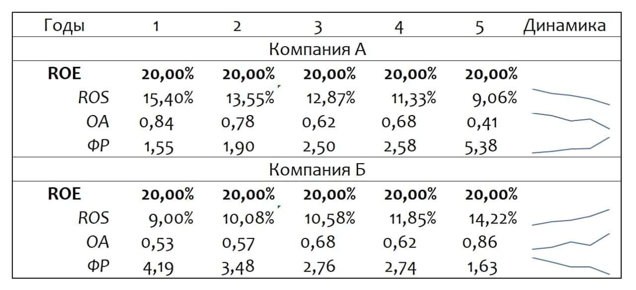 Ну а теперь взгляните на примеры компаний (на картинке внизу👇), имеющих одинаковую динамику ROE, но с разбивкой этого показателя на составляющие формулы Дюпона. Очевидно, что с точки зрения финансов дела у Компании А заметно хуже, чем у Компании Б – падение маржинальности продаж и оборачиваемости активов вкупе с ростом финансовой зависимости ставит под угрозу финансовое положение, хотя динамика ROE об этом не сигнализирует.
