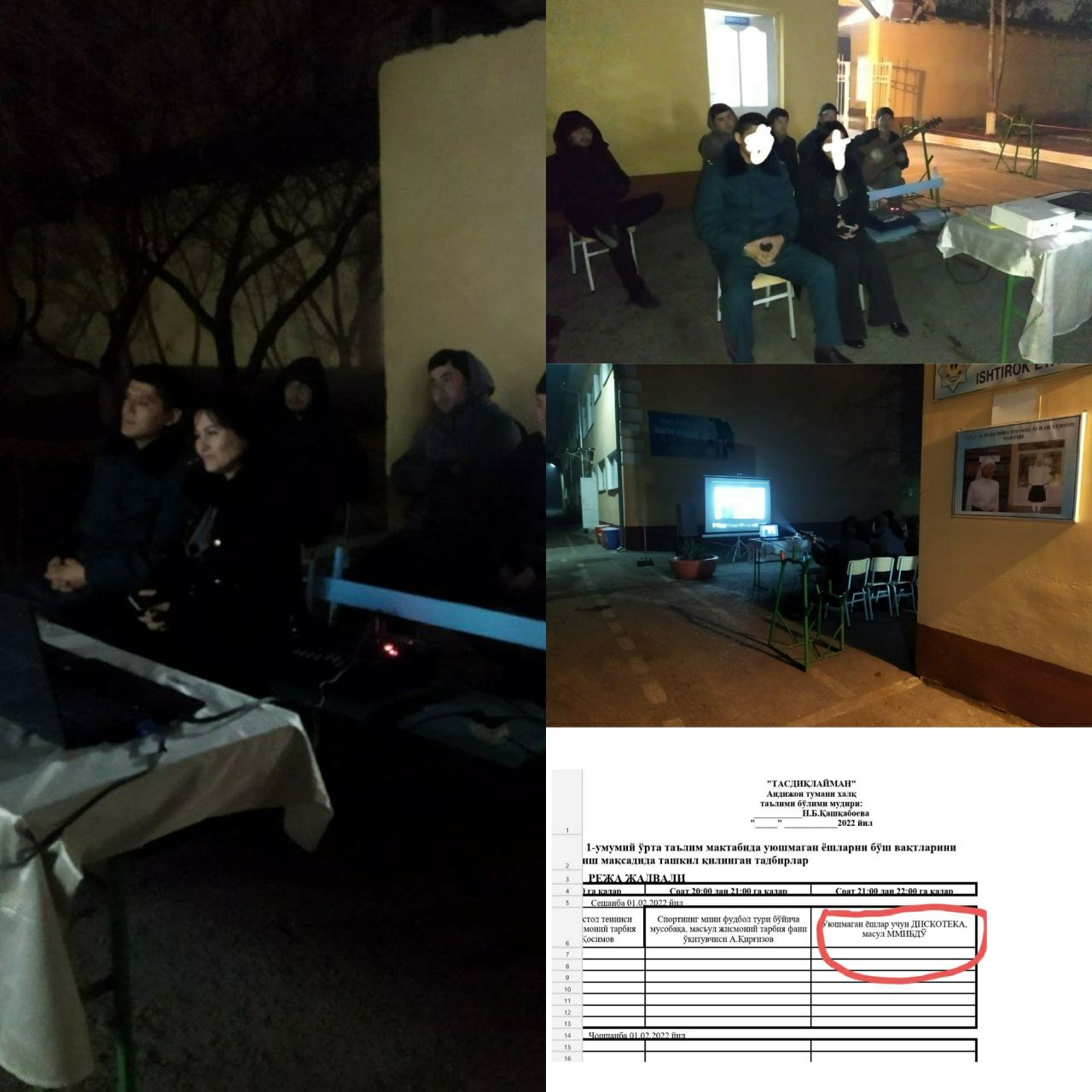 Масалан, юқоридаги расмларда Андижон туманидаги 1-мактабда дискотека белгиланган режа (MC Excel варианти) ва Андижон шаҳридаги 47-мактабда кечаси ҳовлида совуқда фильм томоша қилаётган "бахтиёр ёшлар" акс этган.