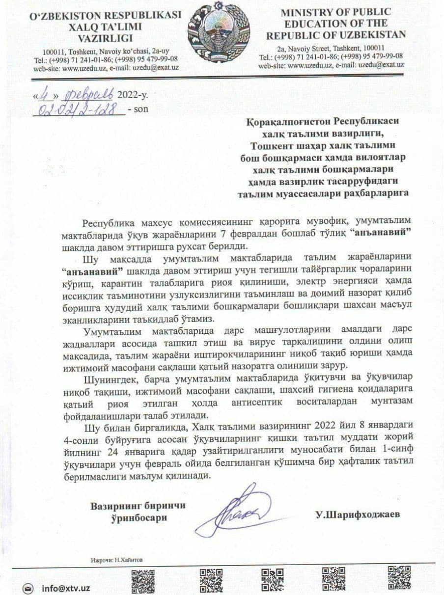 ❗️Эртага, 7 февралдан бошлаб республикамизнинг барча умумтаълим мактабларида ўқув жараёнлари тўлиқ "анъанавий" шаклда давом эттирилади.