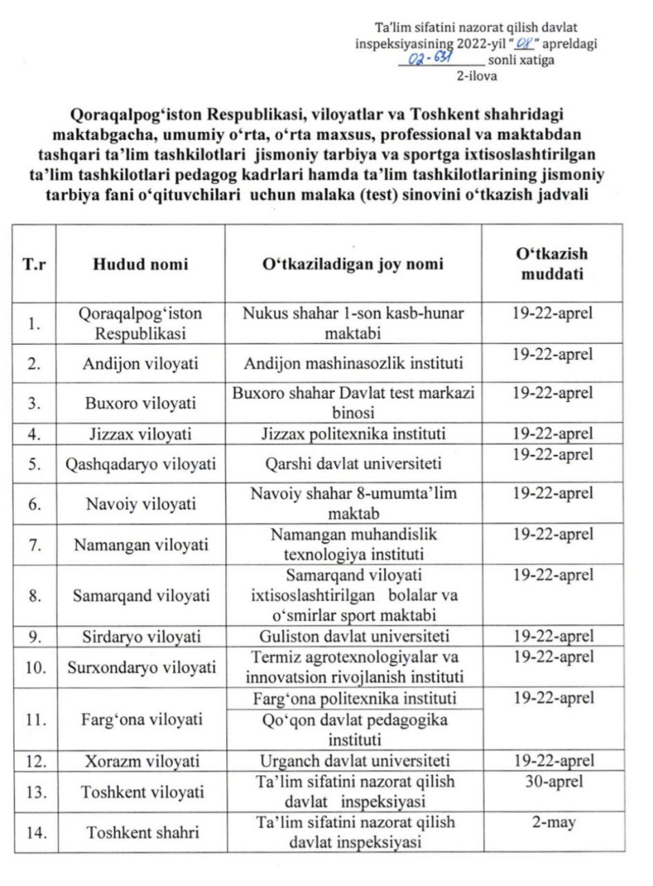 ❕Эслатма: Жисмоний тарбия фани ўқитувчилари учун тест синовлари Қорақалпоғистон Республикаси ва 11 та вилоятда 19-22 апрель кунлари, Тошкент вилояти учун 30 апрель куни ҳамда Тошкент шаҳри 2 май куни ўтказилади.